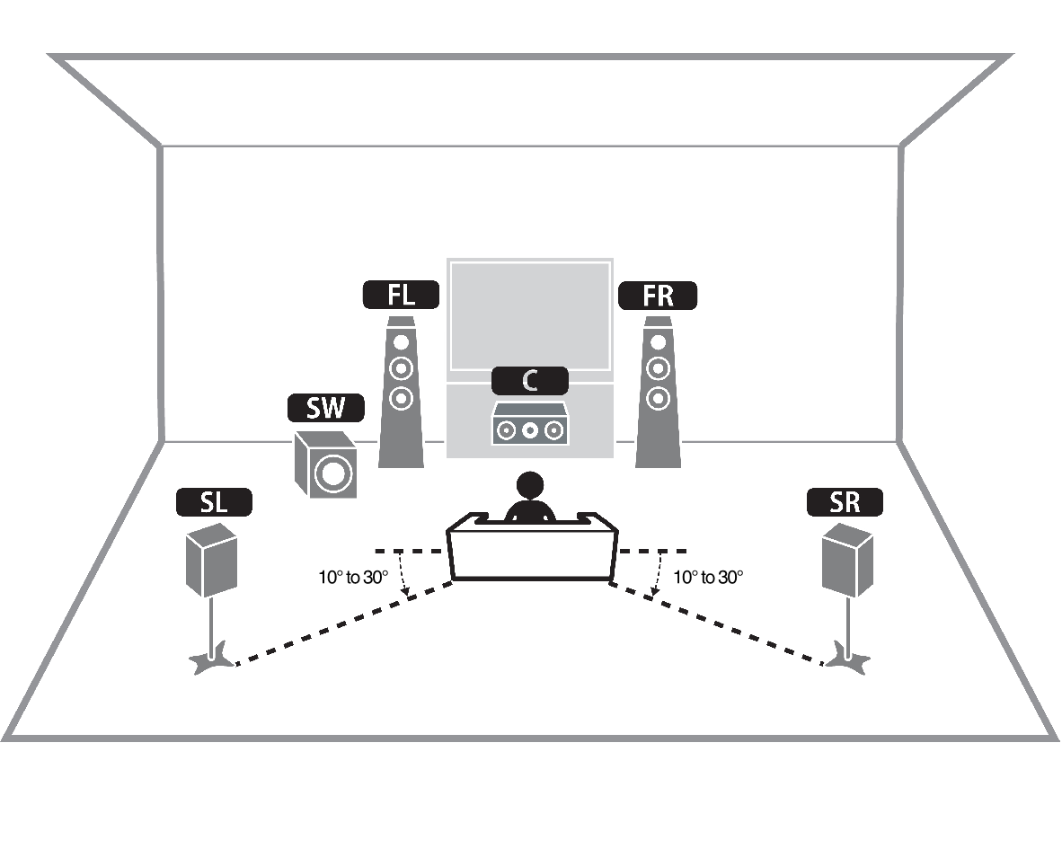 Let's start with the basics of a Surround Sound system, as you can see in the picture. It consists of various types of loudspeakers which, depending on their placement, have their own impact on the sound you experience.